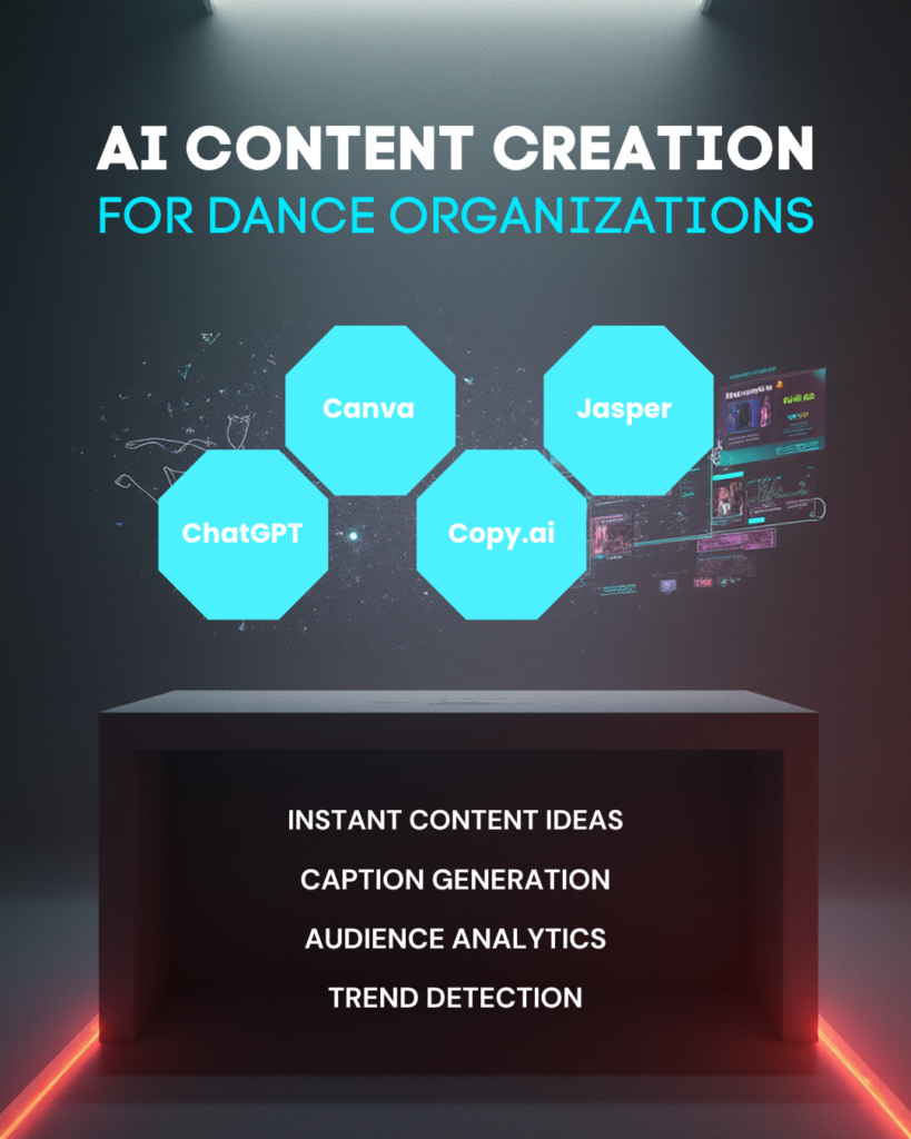 AI can also be an invaluable resource for generating content and caption ideas, making the marketing process easier and more consistent for dance managers and studio owners. Instead of spending hours brainstorming what to post, AI tools like ChatGPT, Canva’s Magic Media, Copy.ai, and Jasper can instantly create themed content ideas, draft captions, and tailor posts to your studio’s tone and brand. These tools can analyze your previous posts, audience engagement, and trending topics in the dance world to suggest what types of photos, videos, or stories will resonate most. Whether you need weekly class promotions, behind-the-scenes ideas, rehearsal highlights, or inspirational quotes, AI can produce continuous creative prompts. This allows studio owners to stay active online, maintain a cohesive brand voice, and connect with dancers in a more engaging and efficient way.